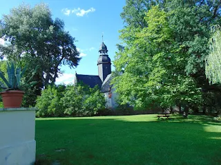 Z parku widać położony tuż za murem kościół p.w. św. Katarzyny...