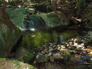 Poszłam dalej zielonym szlakiem wzdłuż potoku Podgórna, po drodze mijając jeszcze raz większe, głośno szumiące kaskady. Później doszłam do asfaltowej drogi, skręciłam w prawo, potem według drogowskazu w lewo - do Kaskady Myi, w leśną ścieżkę, i po kilku minutach byłam już przy pierwszych progach nazywanych Kaskadą Myi. Kaskada Myi są to trzy progi skalne, położone co kilkadziesiąt metrów. Najwyższy z nich ma 5 metrów wysokości i jest czwartym najwyższym wodospadem w polskich Karkonoszach. Z braku czasu zobaczyłam jedynie najbliższy próg skalny. Gdybym poszła jeszcze dalej (nie prowadzi tędy żaden szlak), to zobaczyłabym 5-metrowy wodospad. Tego dnia jednak, kaskada Myi była prawie wyschnięta, co widać na moim zdjęciu.